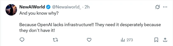 你知道为什么吗?因为 OpenAI 缺乏基础设施!!他们迫切需要基础设施,因为他们根本没有!