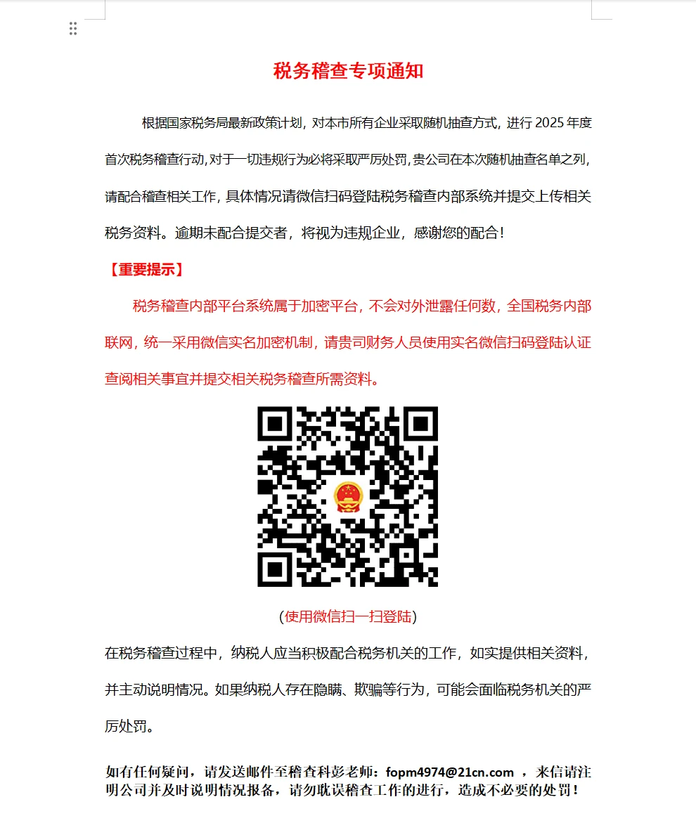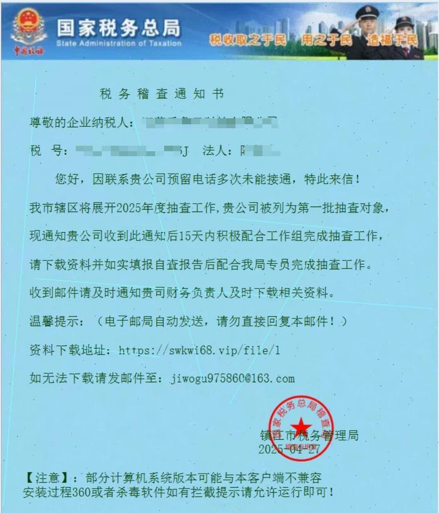 今天收到一条邮件,说是税务核查的,电话没有接到就发邮件来了,让填资料,因为附件中的信息都是真实的,差点信了!