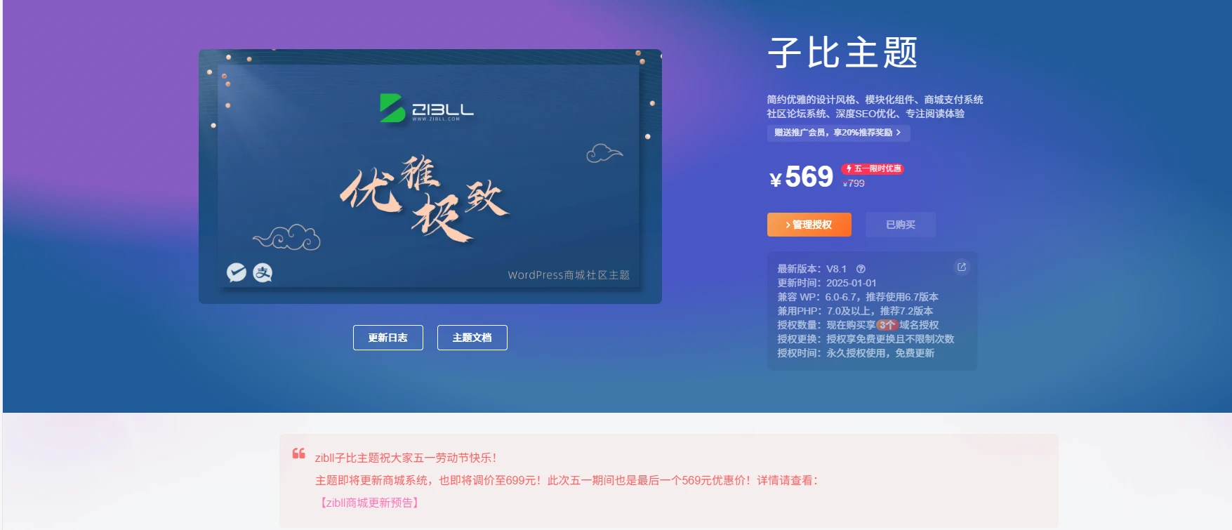 主题即将更新商城系统,也即将调价至699元!此次五一期间也是最后一个569元优惠价!详情请查看: