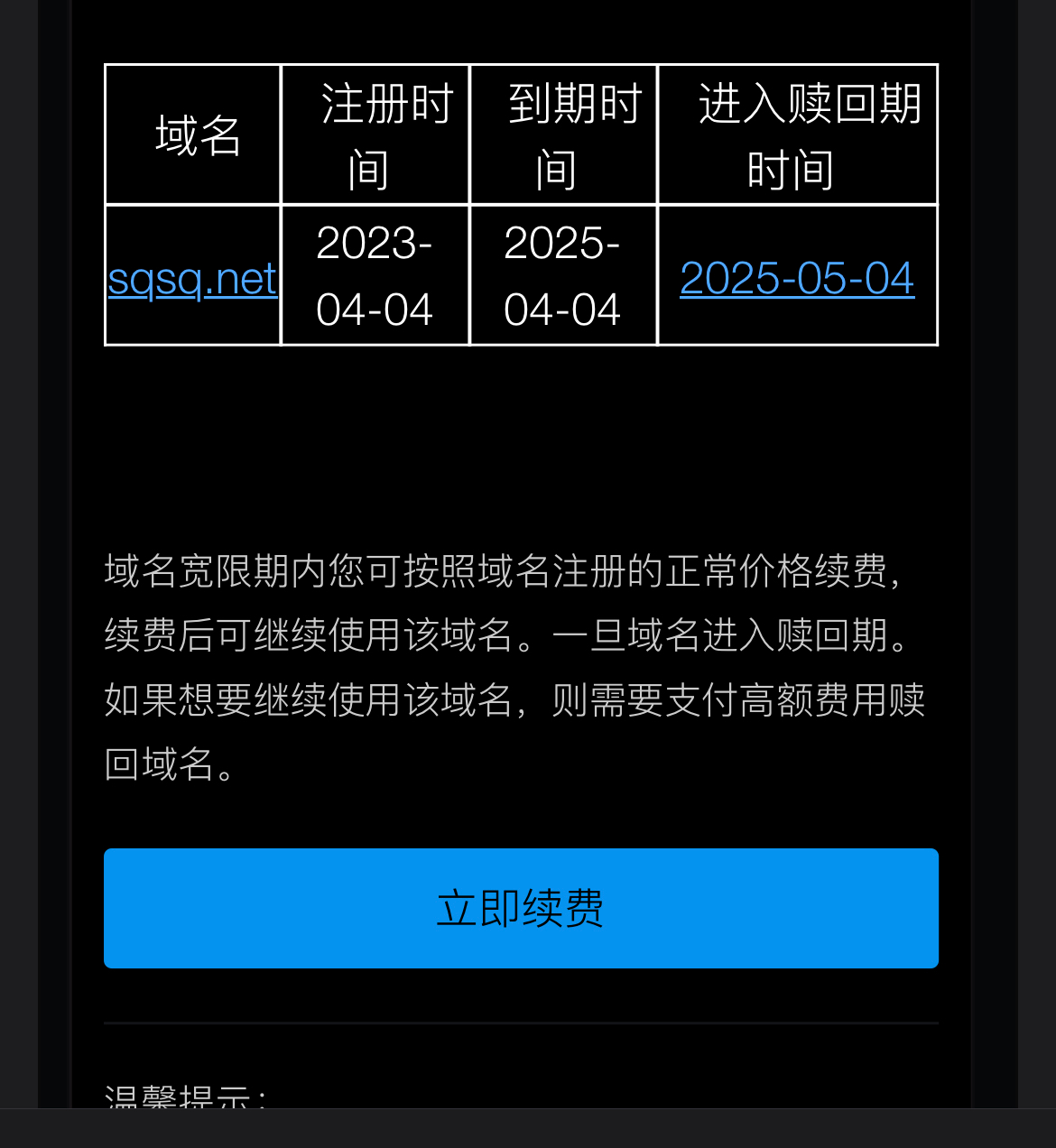 net这会续费95 马上涨到105一直犹豫要不要续,属实是食之无味弃之心疼。今天在闲鱼看到代续费只要官价八折果断两个域名各续了一年。想续费的可以去找找代续费 阿里腾讯平均都是八折左右(估计也是为了套余额)能省就省些