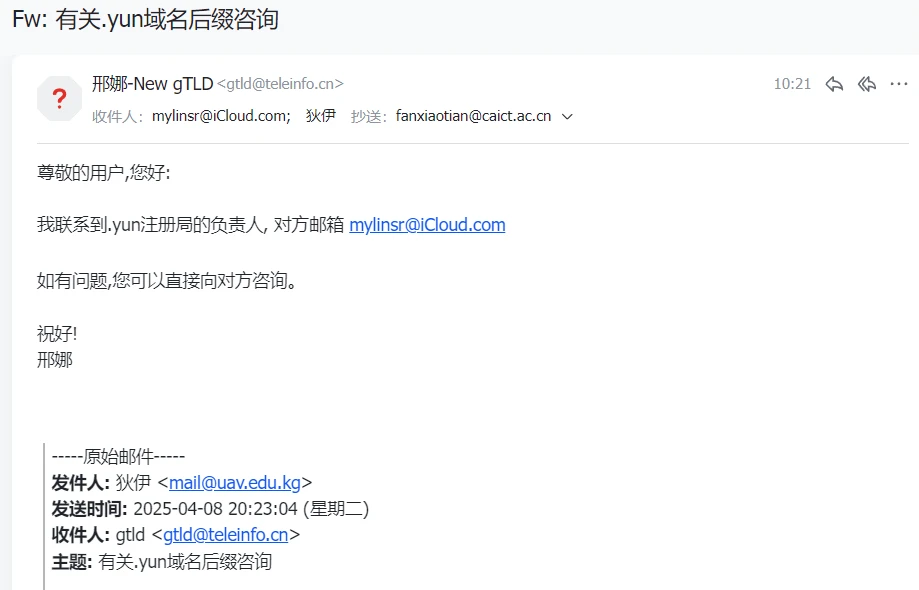 说.yun注册局的负责人, 对方邮箱是 mylinsr@iCloud.com