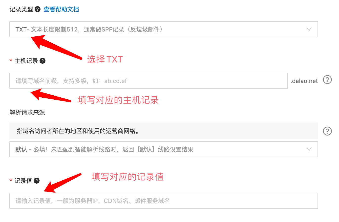 单击添加记录,记录类型选择为TXT,填写步骤1中站方提供的主机记录、记录值,其余参数保持为默认填写即可。