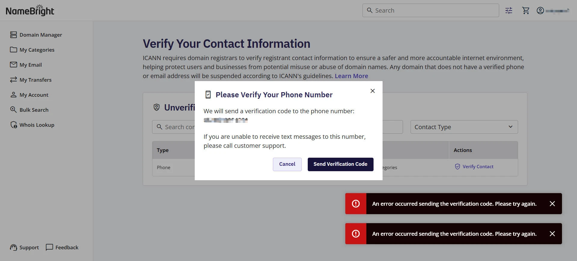 如图,域名联系方式我填的是中国手机号,但是验证手机号,一直错误,收不到验证码,有人遇到同样问题吗?