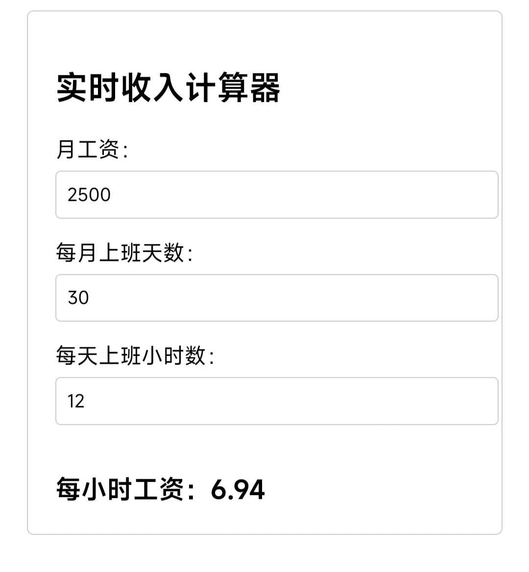 这是一款由某某AI生成的实时工资计算题,他能粗糙的计算出你的时薪是多少?只需要你输入“月薪,月上班天数,每日上班工时”。简单粗暴,让牛马有希望,让你的知道付出是有回报的,虽然不多,但总归是有的。