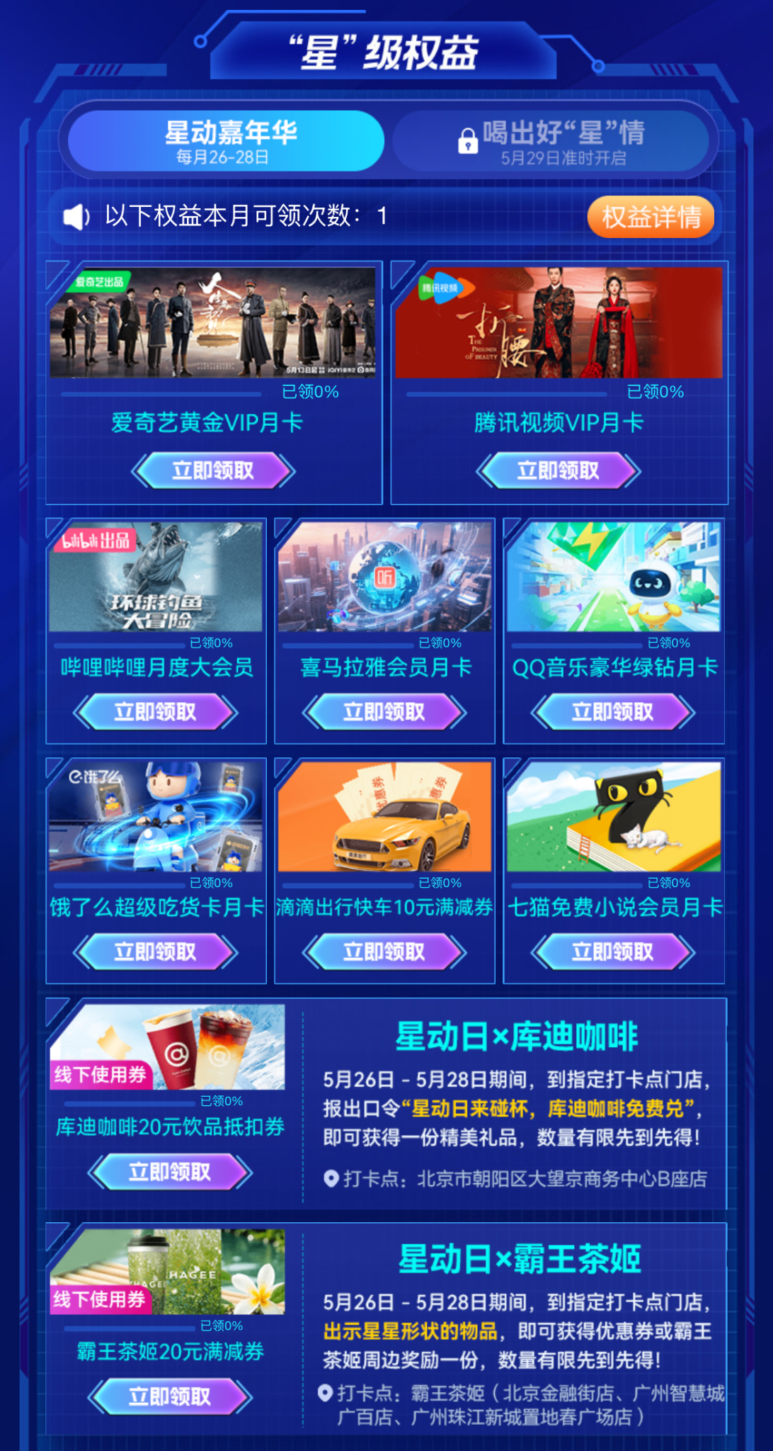 全球通用户26—28期间可领取一款权益,26号上午10点开始。