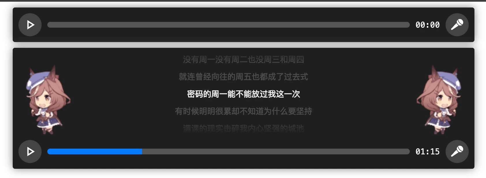 同一页面放置多个播放器时,播放其中一个另外的会自动暂停,播放器画蛇添足加了个跳舞小人😄第二首实例歌词我手动对的时间轴可能部分词对的不准哈没细校对