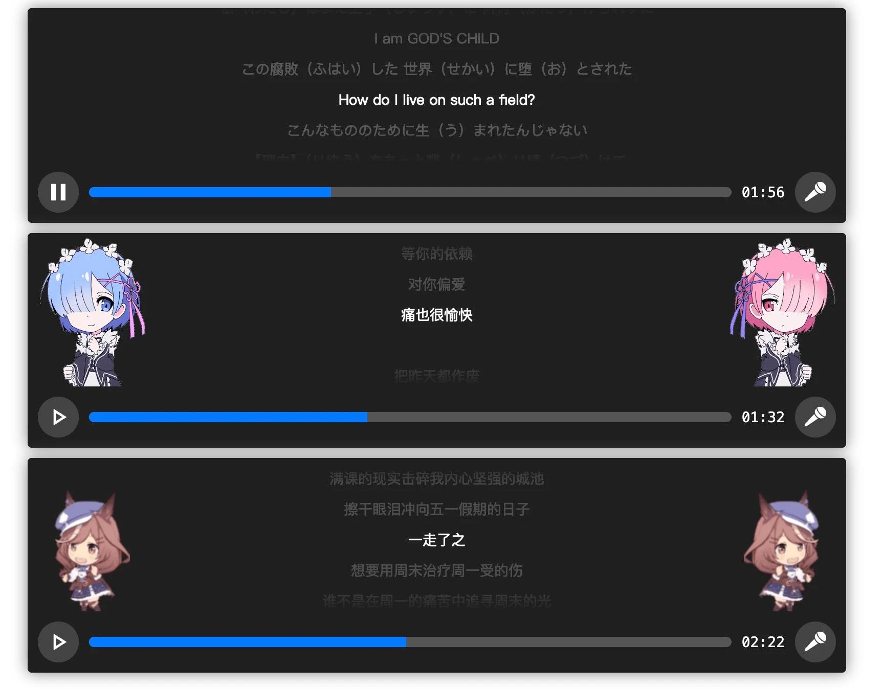 相对于上版本更新内容:支持对播放器加class来实现是否调用动漫小人【可以看默认的三个实例如下图】,解决多个播放器组件在同一页面下切换不流畅bug