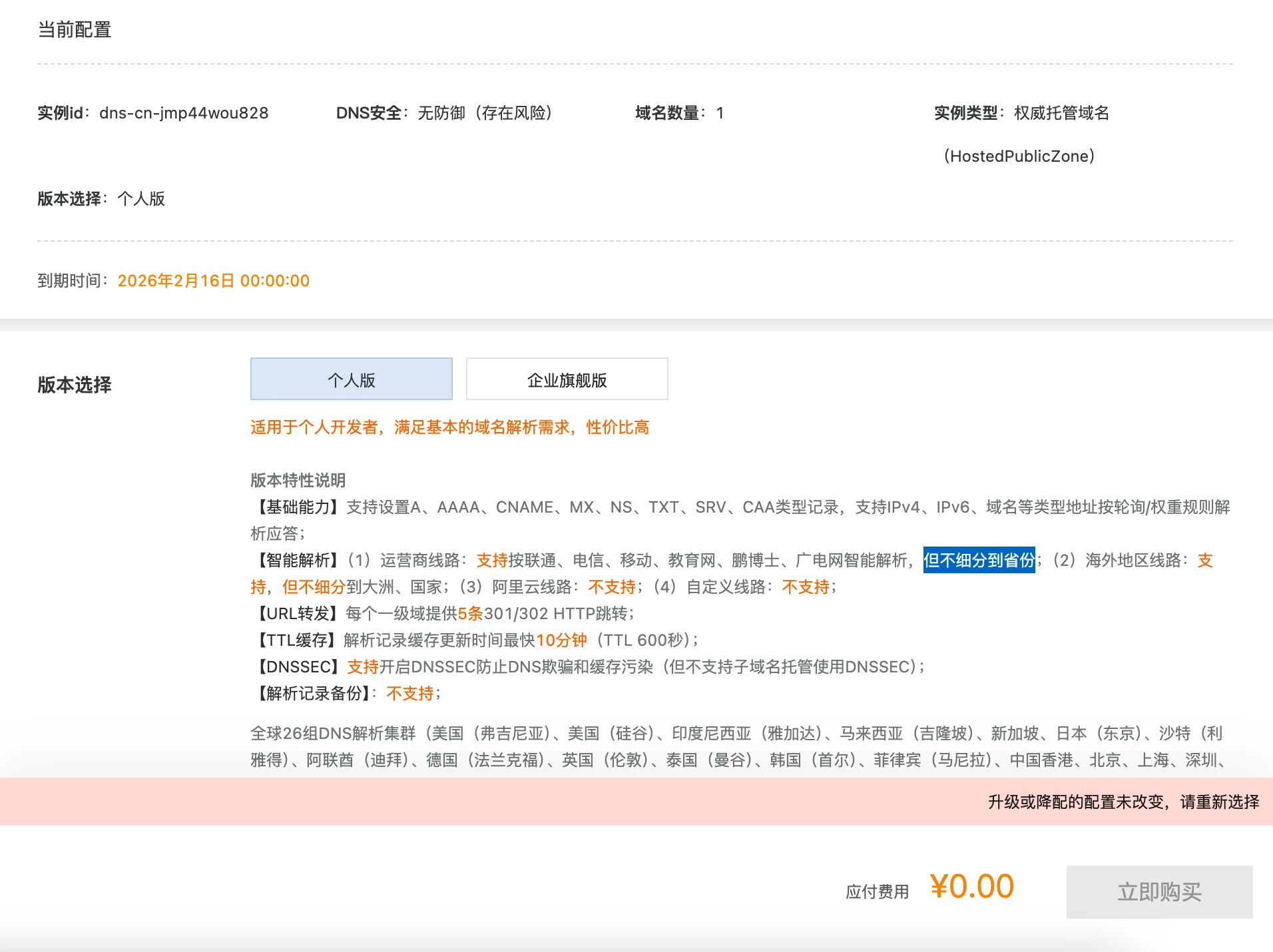 刚发现我的阿里解析专业版已经过期,不支持地区解析了,目前使用的阿里个人版,打算迁移解析到华为云...