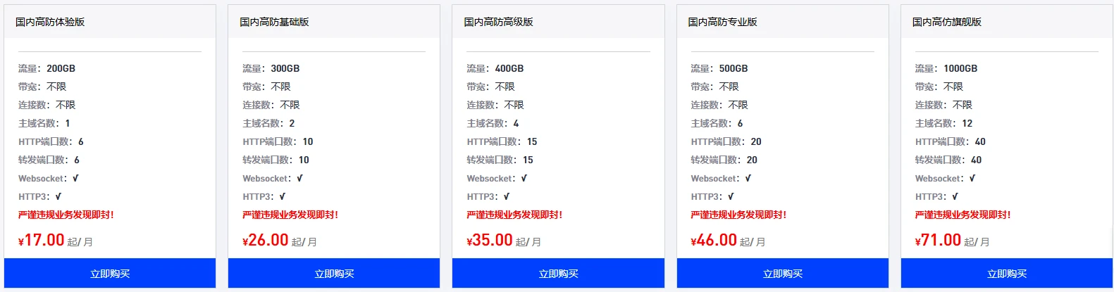 - 基础版 / 高级版 / 专业版✨ 流量逐步升级(最高 1000GB),主域名、端口数灵活扩展,不管是企业官网、电商平台,还是高并发业务,都能扛住攻击,保障稳定运行;
