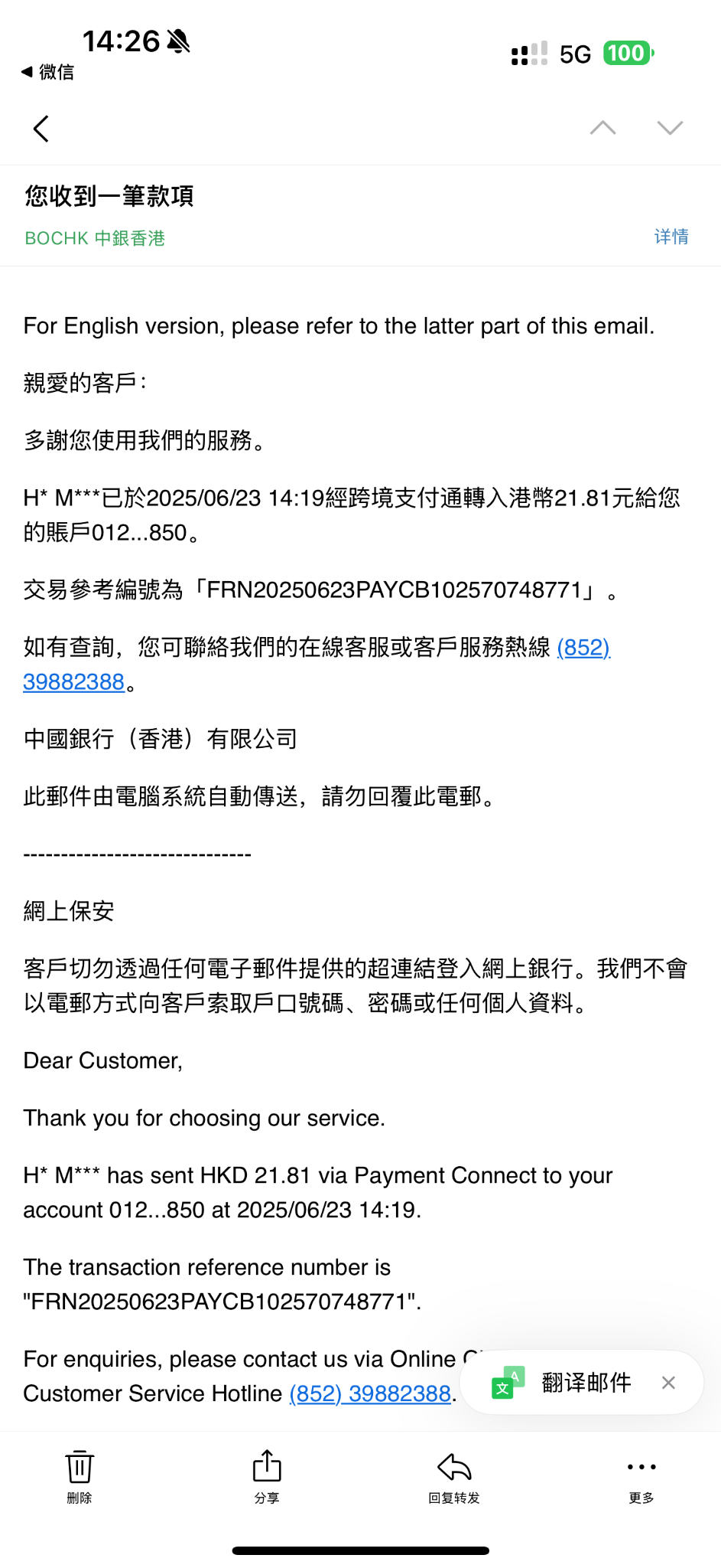 刚测试招商银行跨境支付通,转账香港银行。输入密码 3 秒左右即时到账