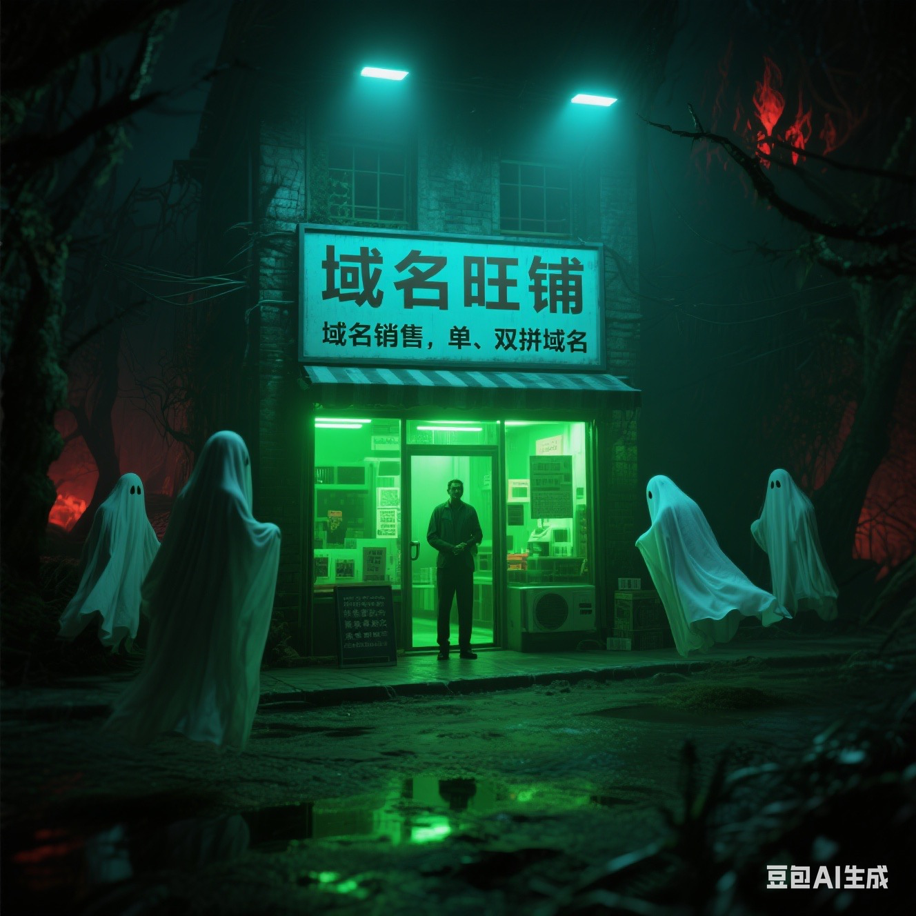 关键词:生成一张带有奇幻、诡异氛围的图片,关键词有:• 场景:夜晚、地狱、非人间• 元素:绿色灯光、幽灵(人形白布道具 )、店主、商铺(商铺名字“域名旺铺”门前有牌子写有字域名销售,单、双拼域名等字样 )• 氛围:诡异、奇幻、反差感 ,利用特殊光线和道具营造出超现实的视觉效果。