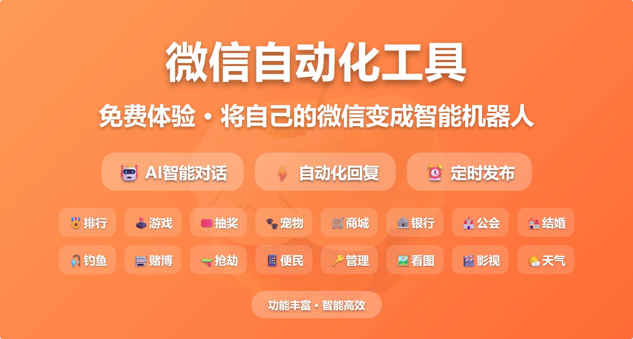 一个简洁美观微信自动化工具,让您的微信号变变成智能机器人!可自动同意好友申请,在群聊/好友中可以自动回复消息、AI智能对话、定时发送消息、入群提示、玩游戏、查天气、看图片等等。