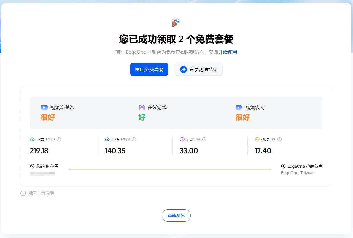 一键分享你的测速结果,即刻解锁免费套餐。无需兑换码,无需等待!