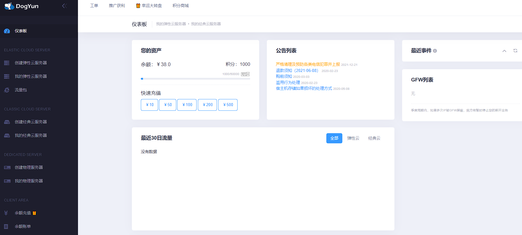 在狗云抽到不少余额礼券,终于足够余额可以开VPS了。