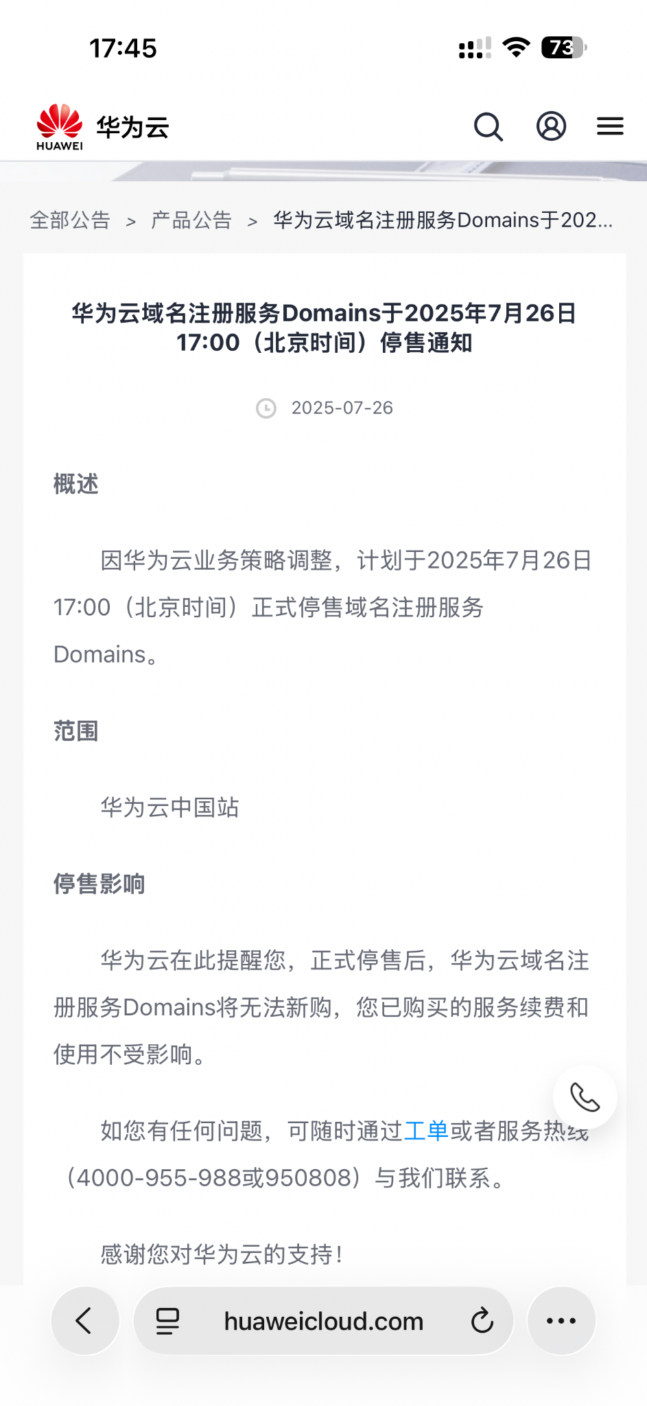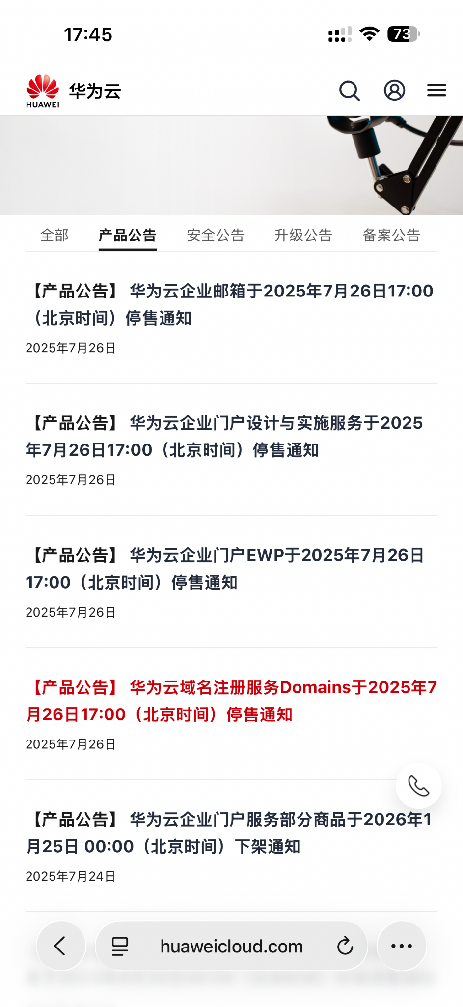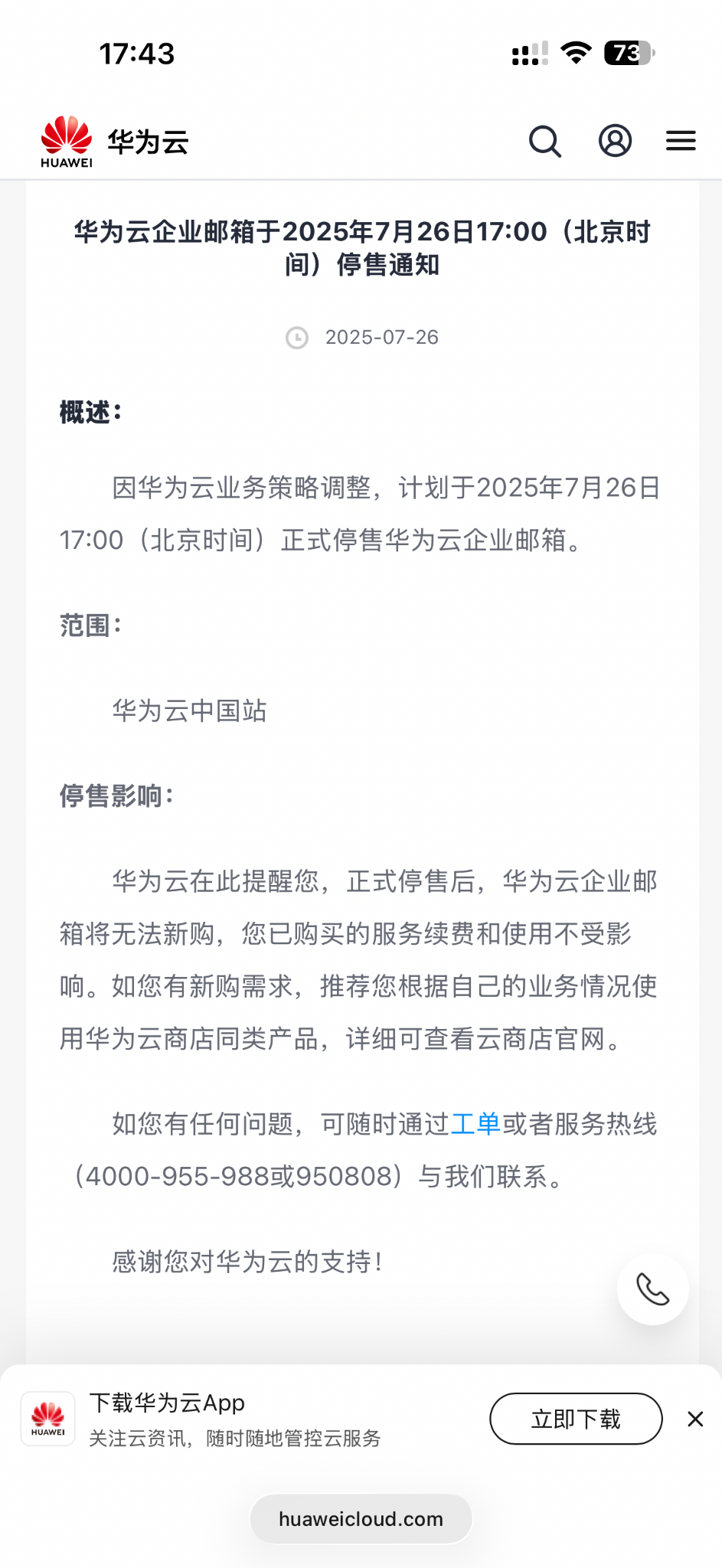 华为云宣布域名注册、企业邮箱等服务正式停售。