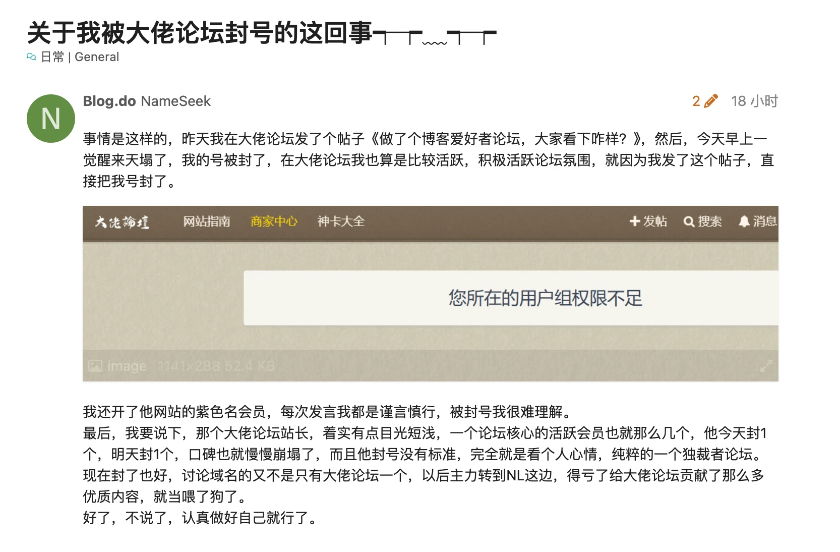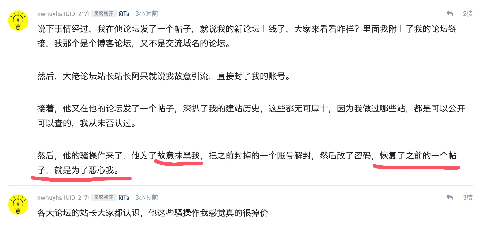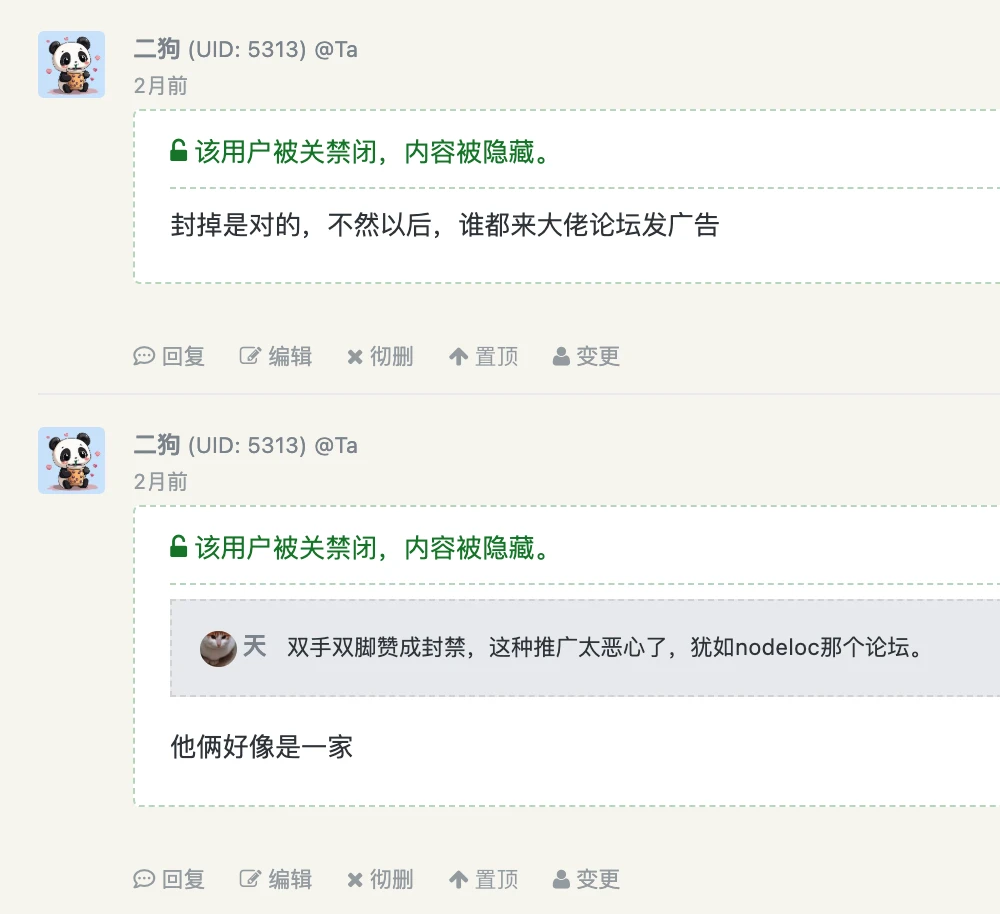 并且在对应帖子下面,其小号“二狗”还角色扮演路人发布评论:”封掉是对的“,以及回复网友他引流的论坛和nodeloc是一家的。