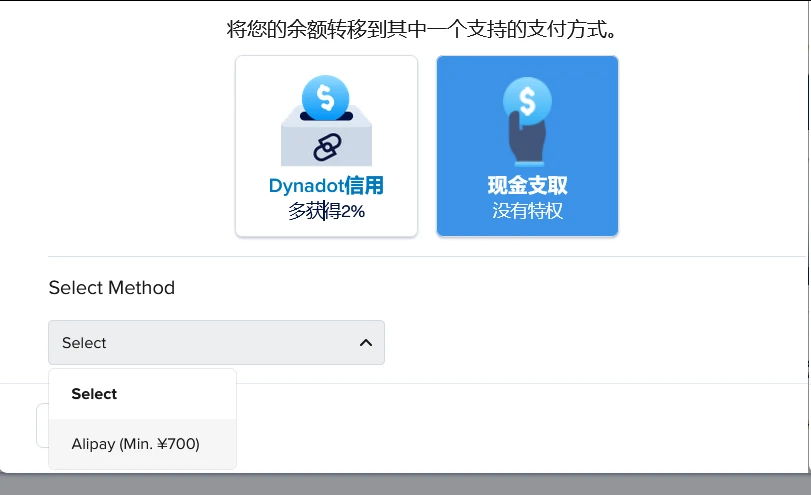 出了一个米,支付宝要最低700才能体现,还有一个dynadot信用,没看懂什么意思,就一百多,想提出来该咋整?