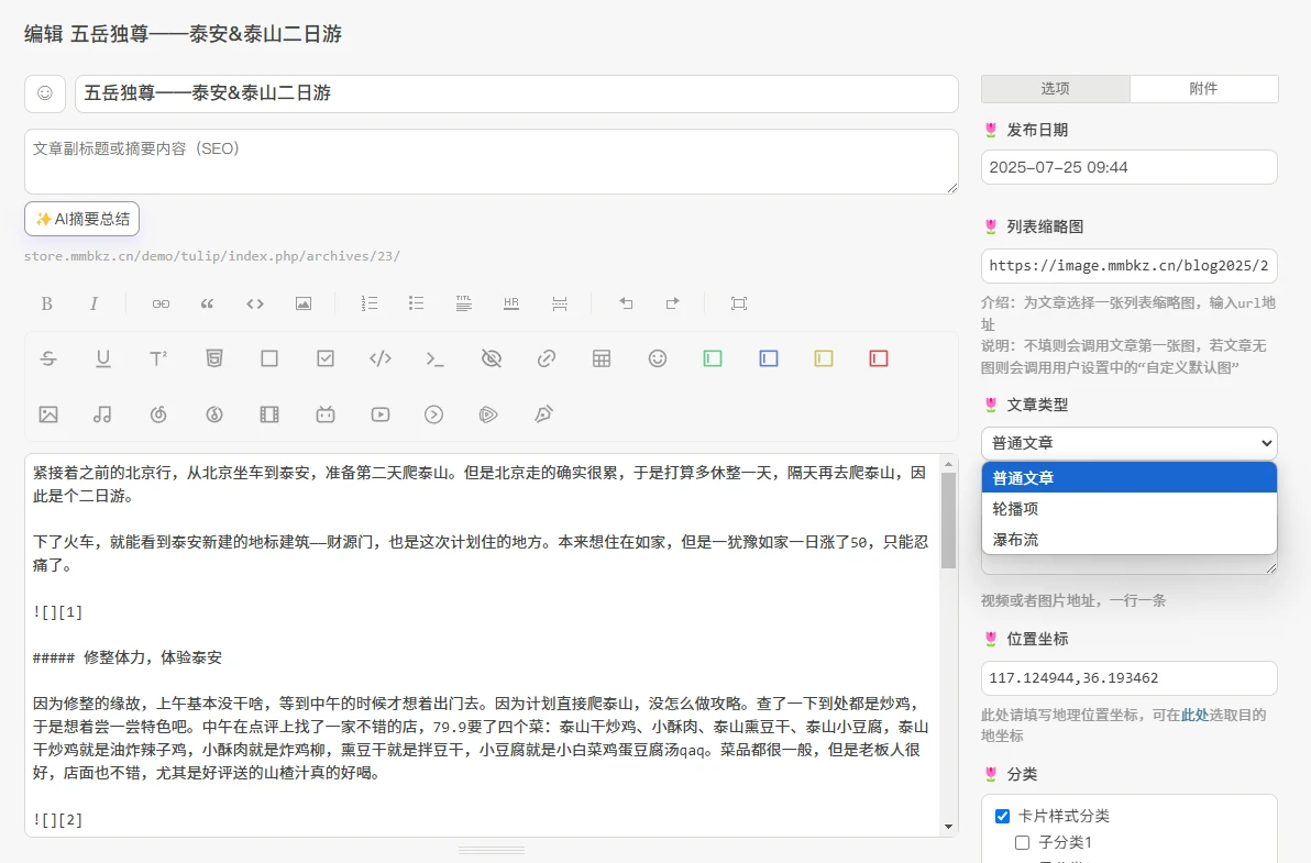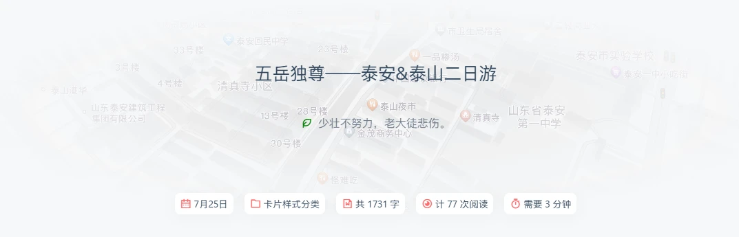 首先介绍一下顶部:顶部会显示文章的基本信息:包括标题、描述(可以使用主题自带的AI摘要功能)、发布时间、文章所属的分类、字数阅读时间等统计。在填写位置坐标后会在背景显示所指向的地图。当然可以换成一张淡淡的背景图。