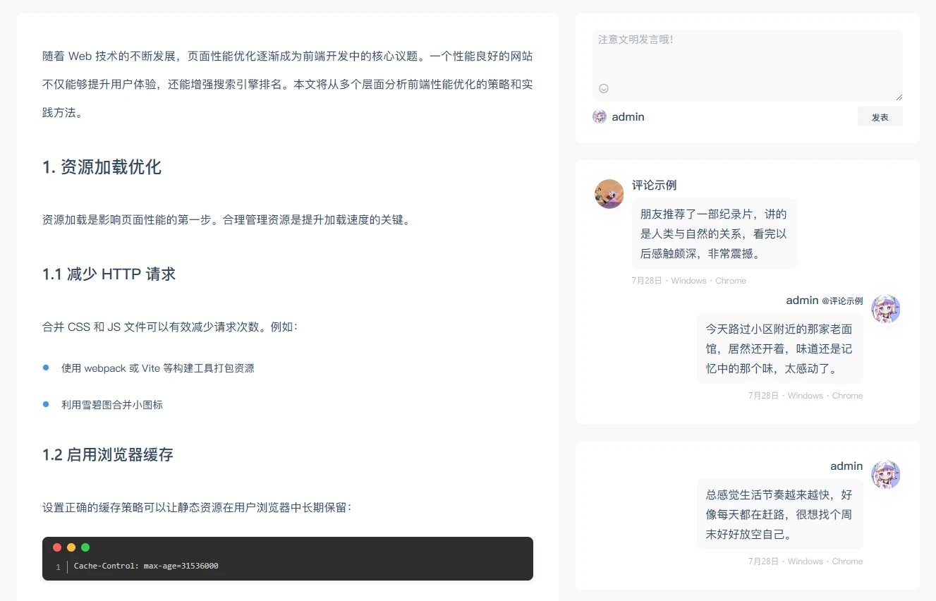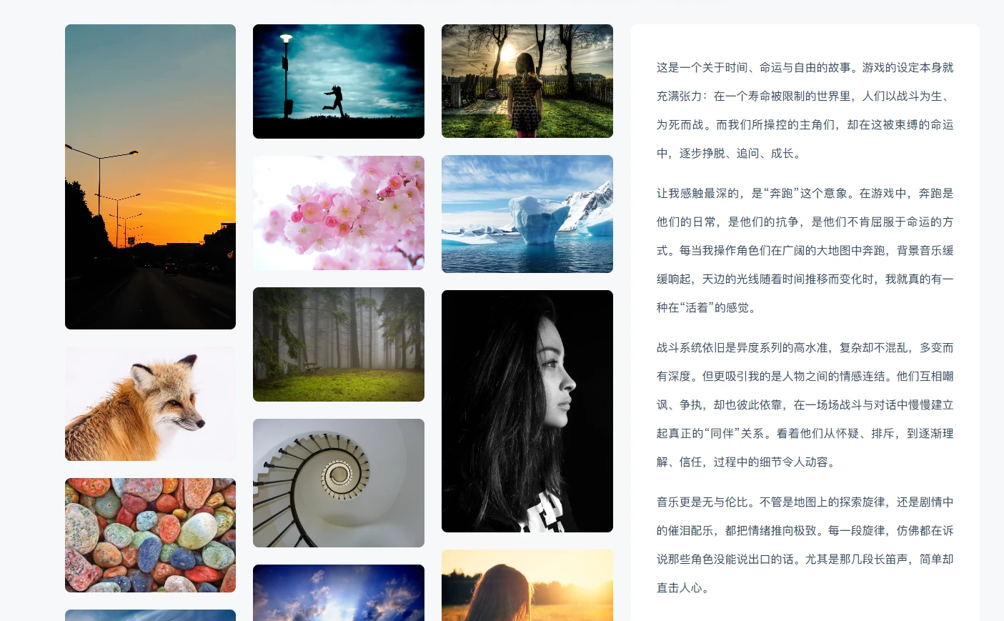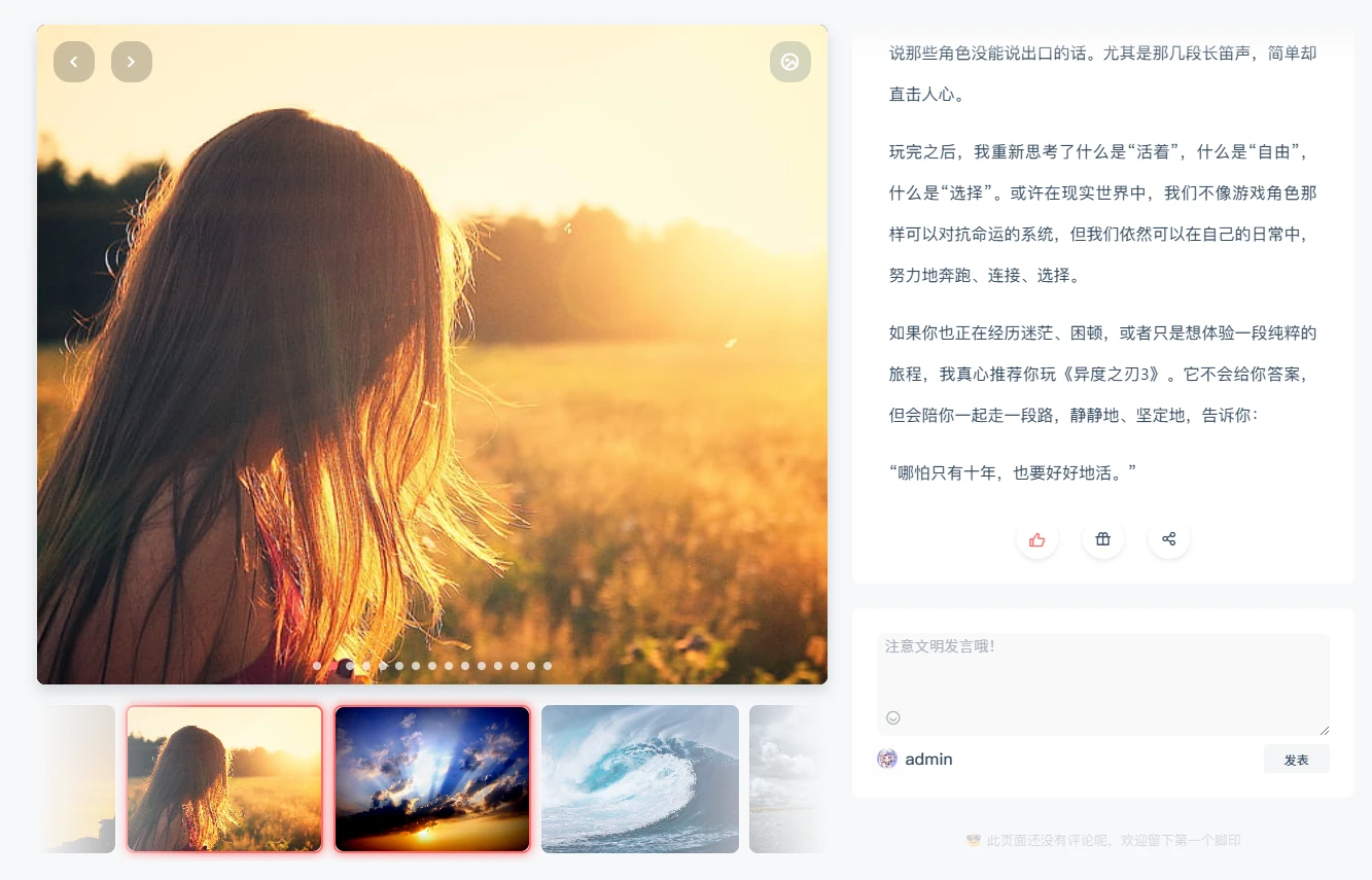 第二种是瀑布流相册展示类模板。这种模板很适合多种图片展示,同时也可以展示视频内容。比如作为一个相册来展示。而右侧则是文章内容和评论区。一般图片展示类的文章配文都很少,因此放在右侧栏是很合适的。