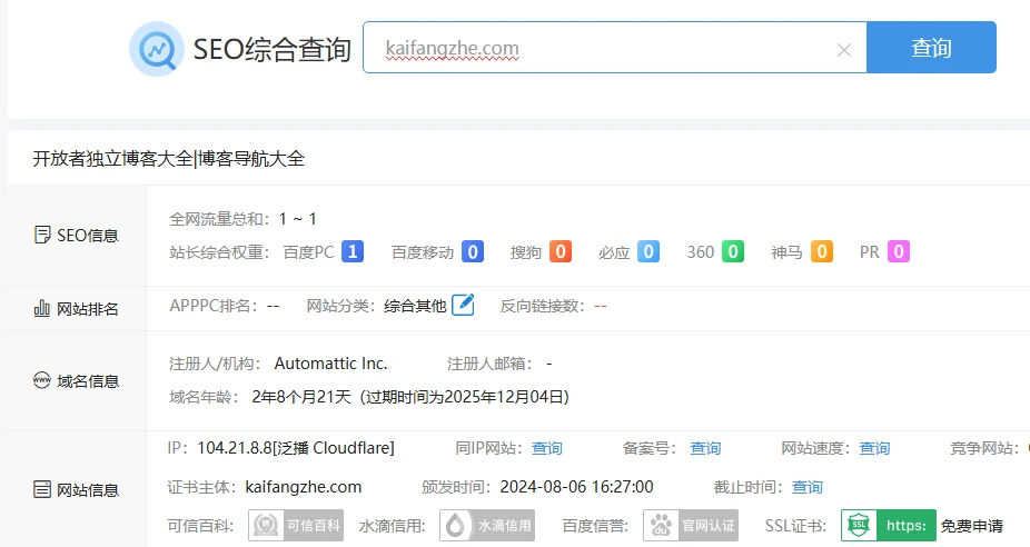 恭喜 开放者独立博客大全 百度网页权重1了,移动权重又没了