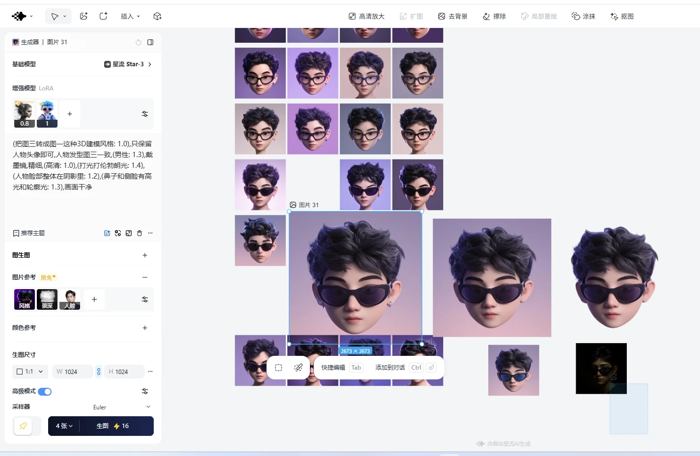 在画布可以直接点击图片输入修改意见直接生成,不断去微调效果,我就让它去掉了耳钉、修改了灯光、墨镜的类型等等细节,最终效果满意了让他生成了空白背景图。