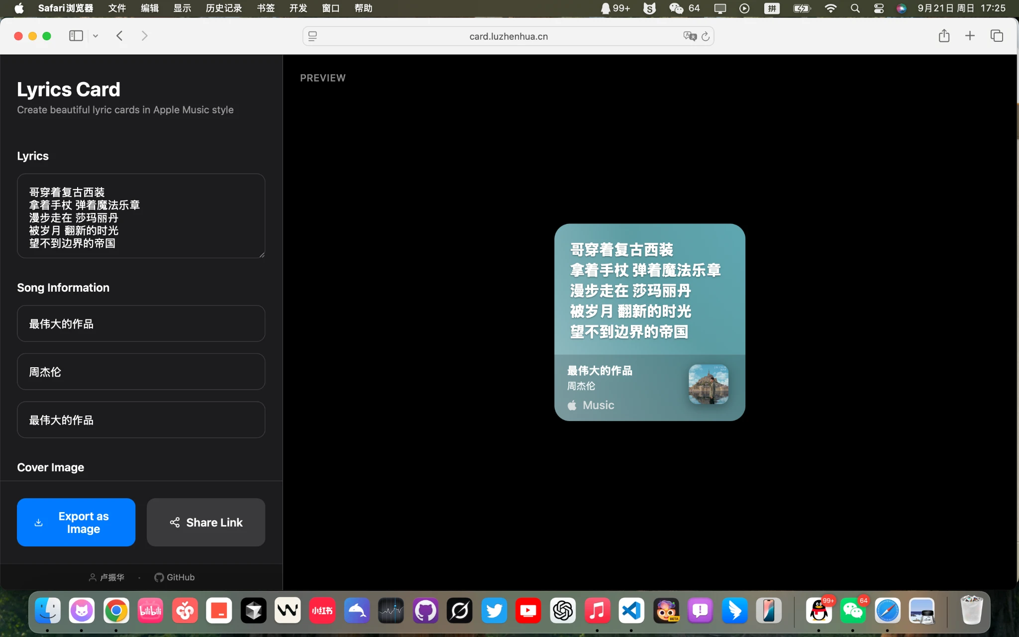 做了个类 Apple Music 歌词卡片生成器,第一次开源 求 star ✨
