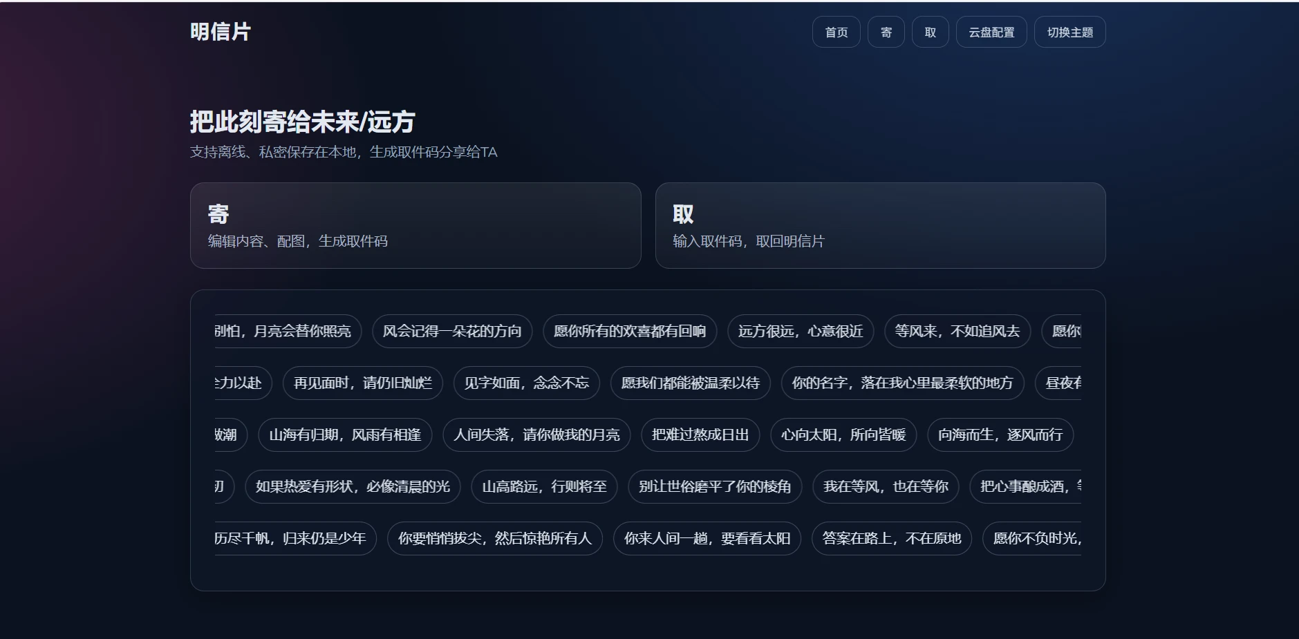 一款面向个人与小团队的“明信片”创作与寄/取网页应用。零门槛上线、无需服务器即可使用,主打“私密本地 + 多样分享 + 精致仪式感”。