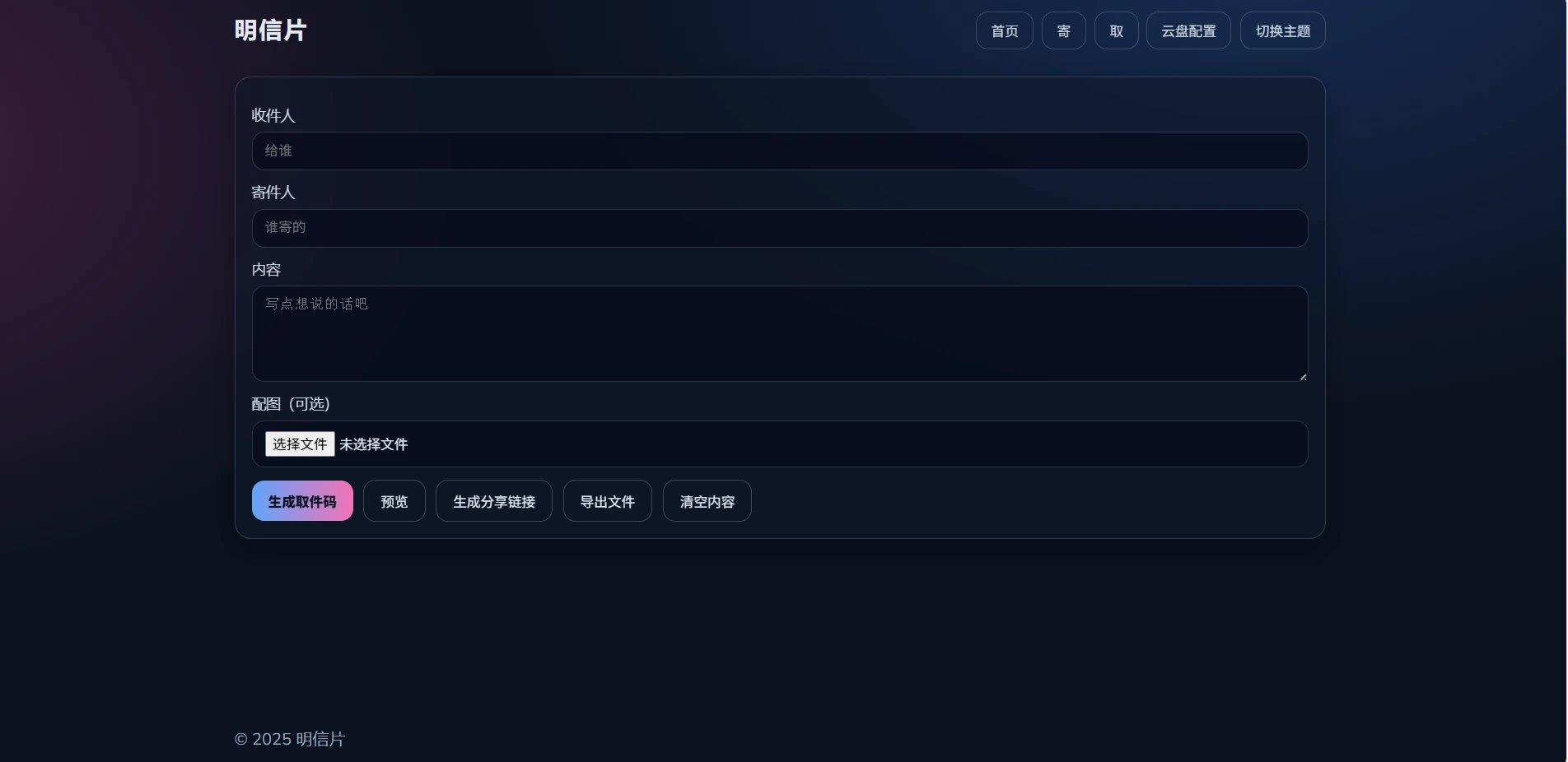 填写收/寄件人、寄语正文,可上传配图(自动转 DataURL)。