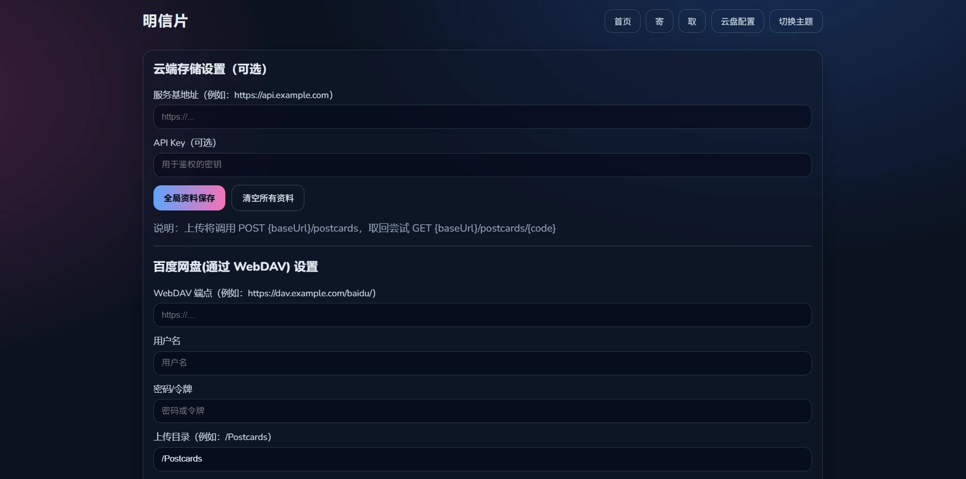 云端:约定 POST /postcards 上传,GET /postcards/{code} 获取(地址与 API Key 可配置)。