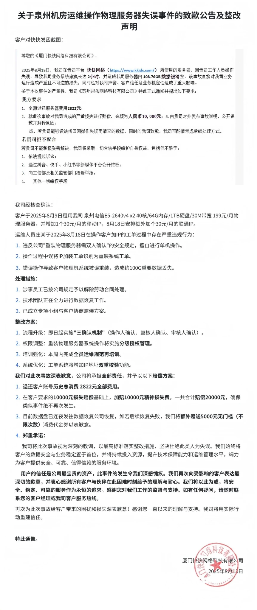 应该是22还是23年,我记得当时007也是因为内部员工矛盾原因,造成大面积的数据丢失,后面的补偿应该是服务器都至少送了一个月左右(也可能我记性不好,记错了,有问题就纠正),反正当时的补偿力度绝对没这个大,所以有点喜欢快快了,但是还是建议用大厂(就觉得放心😌)