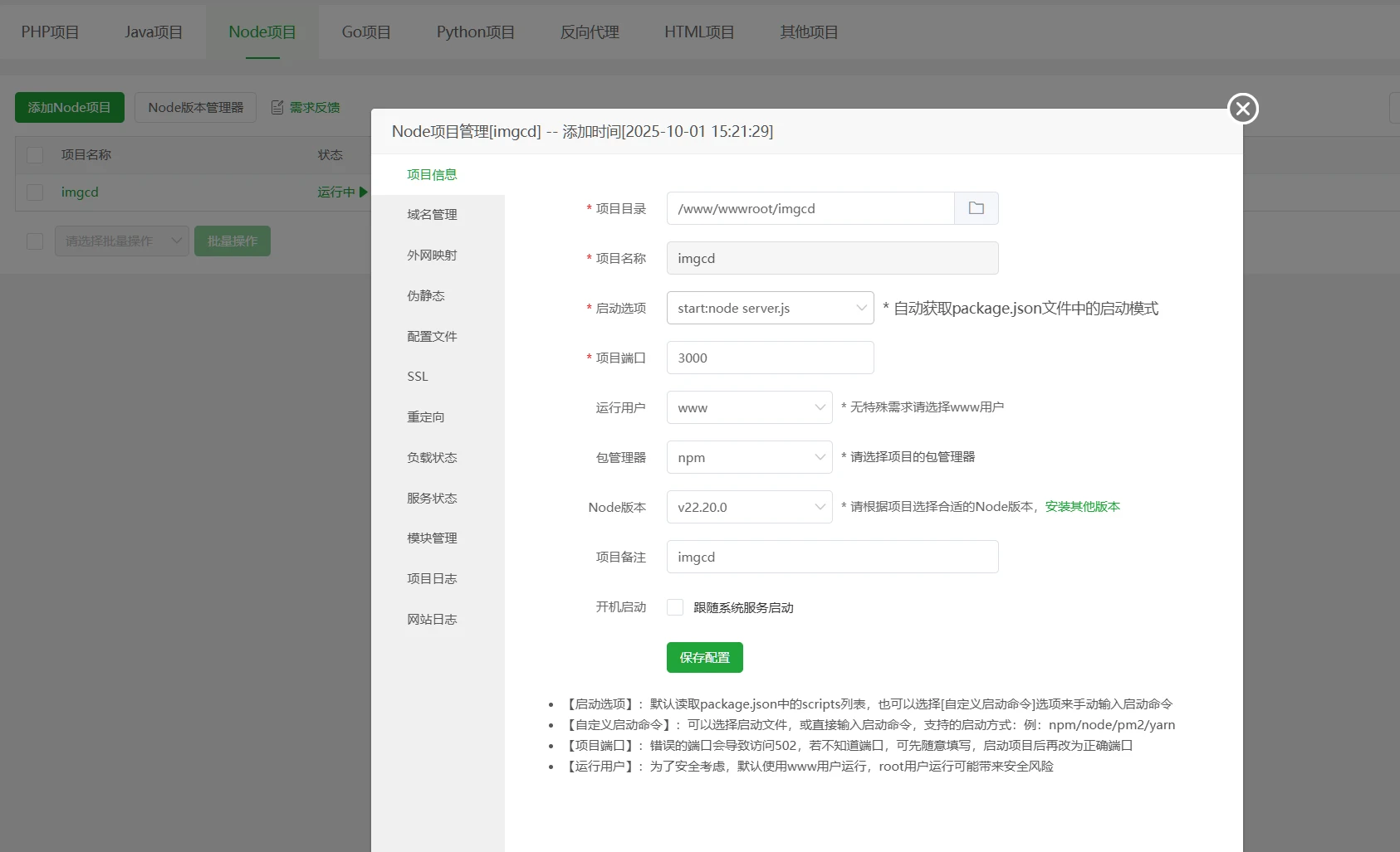 然后开放默认端口3000,绑定域名,开启外网映射(要https的话先找个php项目搞个证书再绑定域名到node项目里)