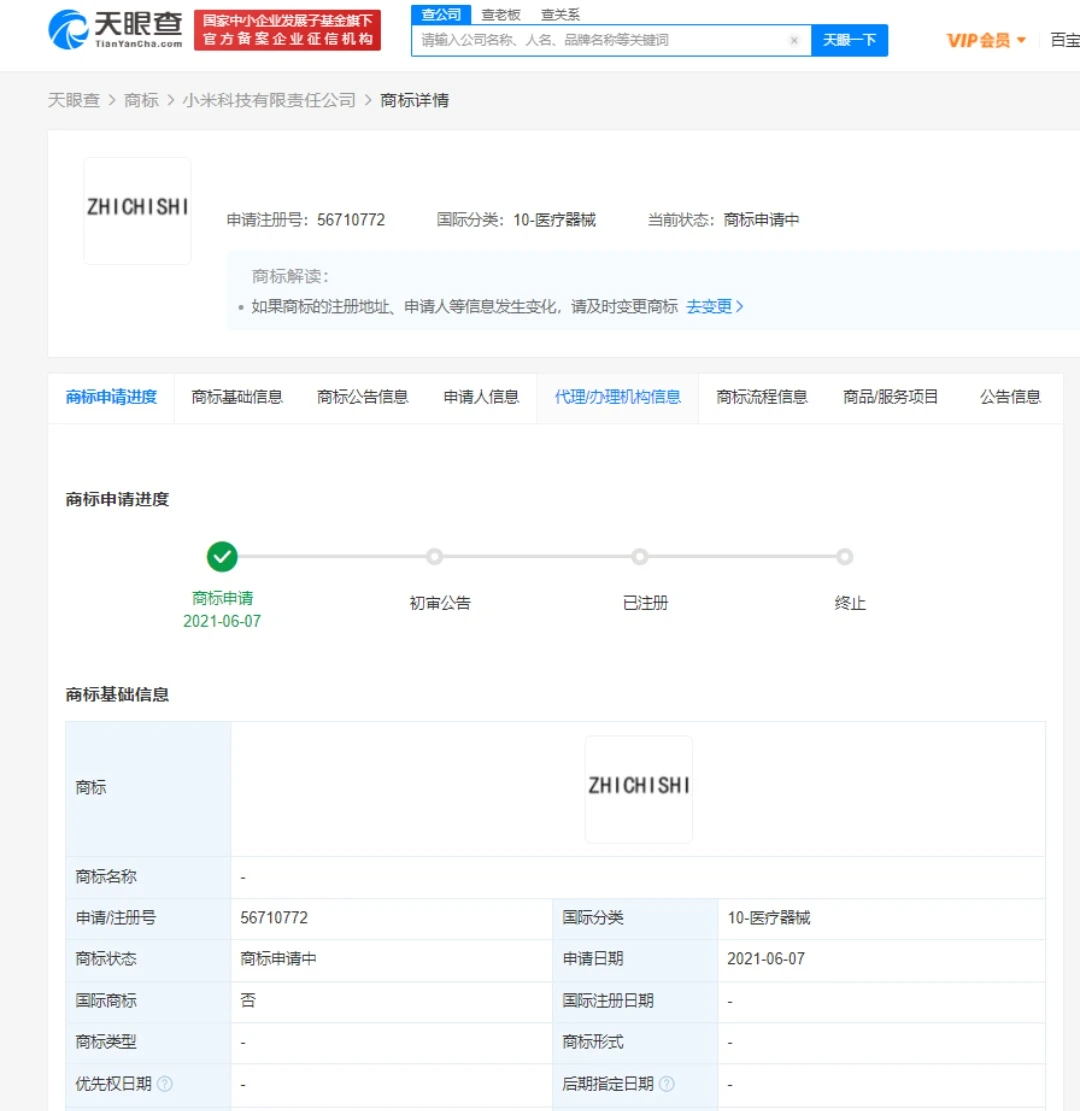 据天眼查APP显示,小米科技有限责任公司申请注册“知吃狮”、“ZHI CHI SHI”商标,国际分类包括医疗器械、日化用品等。目前商标状态为申请中。