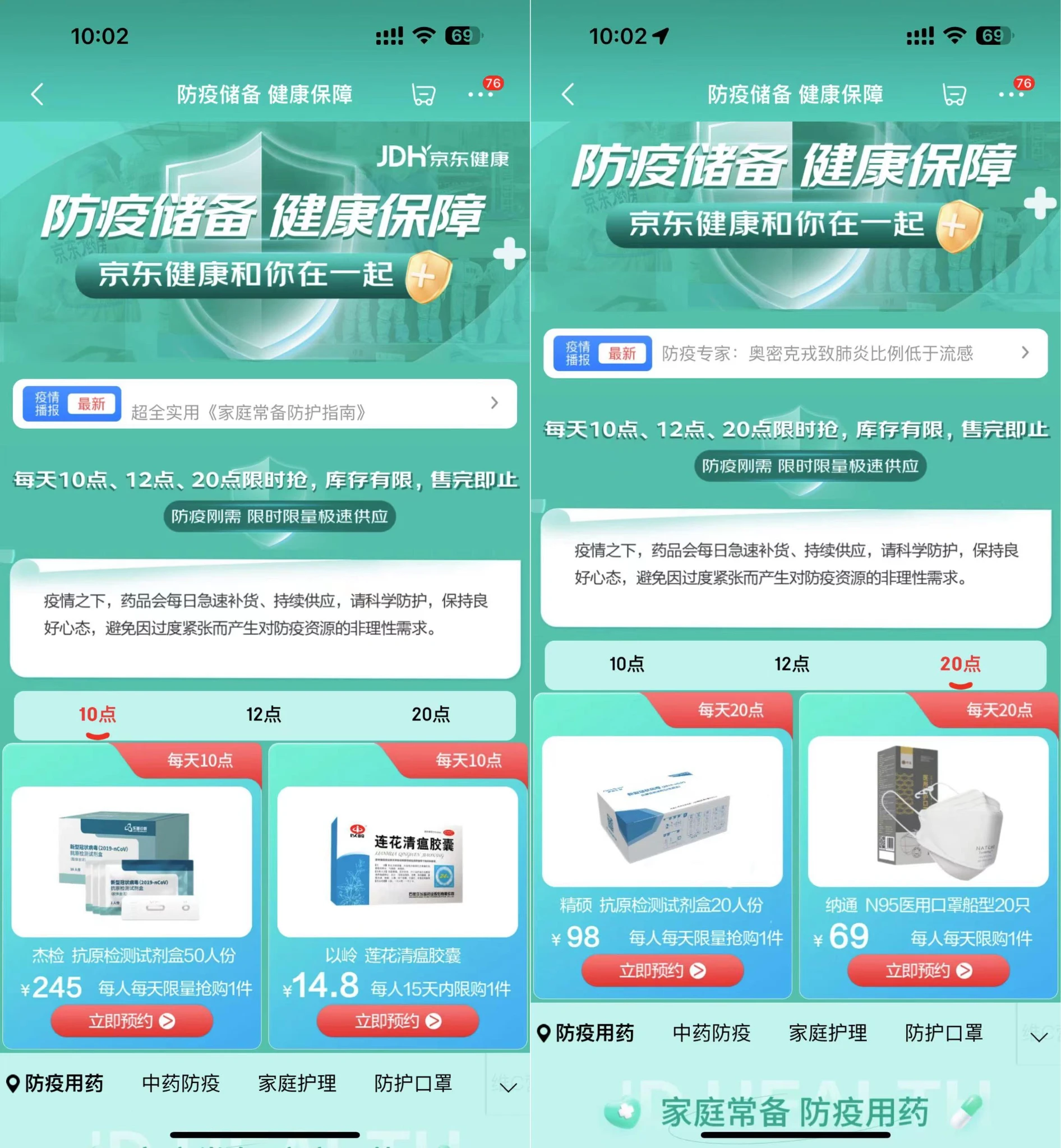 京东健康从今天起,每日10点、12点、20点,为广大用户提供连花清瘟、抗原检测试剂盒、N95口罩等防疫物资一站购买,全力保障稳定供应。
