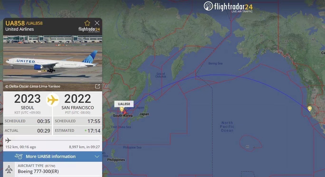 航班UA858于2023 年从韩国首尔起飞并于 2022 年降落于旧金山。