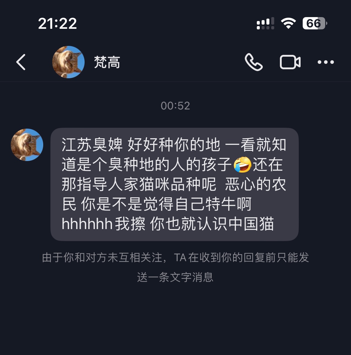 刷到一个抖音up主发的猫咪视频,评论区有人说这是雀猫,up主说不是,别人问是什么品种up主又不回答,我就评论了一下“这不就是雀猫吗”,就尼玛有智障来私信骂人了,这得多高尚看不起农民啊……吃的粮食还不是农民用屎尿灌出来的……