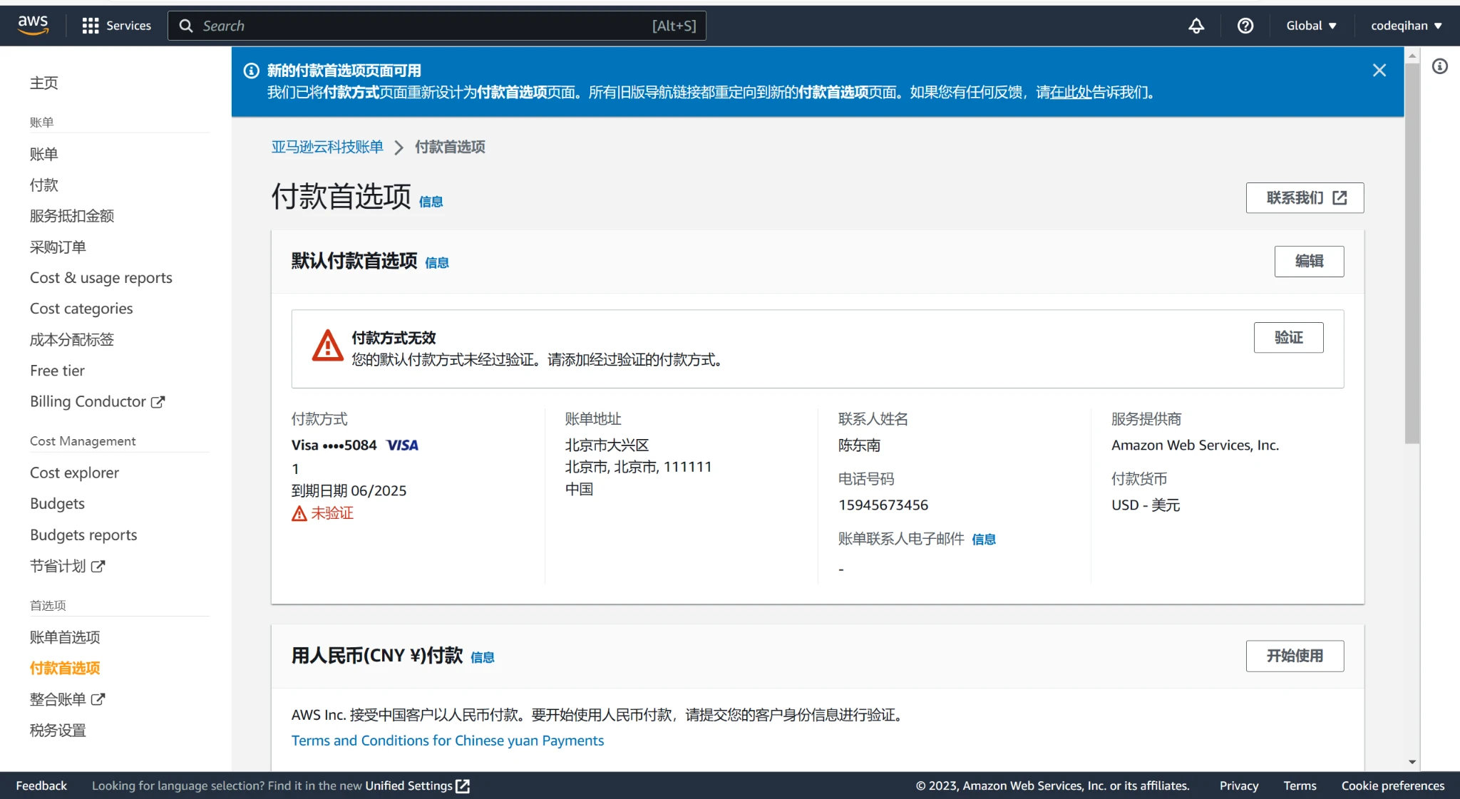 先用自己的信用卡注册,然后在网上生成一个信用卡号码,然后在AWS的信用卡设置页面(点我查看)把这个信用卡填上去,随便填一个名字,要设置成默认卡,地址电话随便乱填(电话要11位数),然后保存,再把原来的卡解绑就可以了,我已经成功了