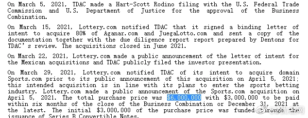 乔治大叔博客爆料,在他查询一份新的sec文件中显示,Sports.com“体育”以600万美元(约合人民币3883万)的价格被收购。该文件中写道:Lottery.com于2021年4月5日公开宣布收购Sports.com,总收购价为600万美元,其中300万美元将在业务合并结束后的六个月内或最迟在2021年12月31日支付,最初的300万美元则是通过发行B系列可转换债券交易。