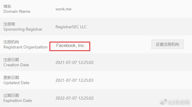 据国外业内人士透露,facebook近日收购了非主流单词域名work.me,具体价格并未透露。目前查询whois信息显示该域名已经在facebook旗下。