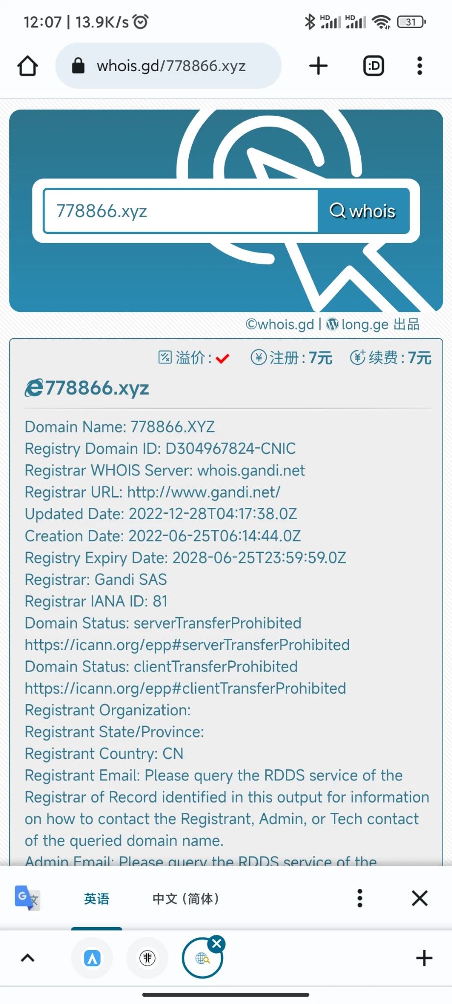 45出个续费只需要几块钱的域名,2028年到期。