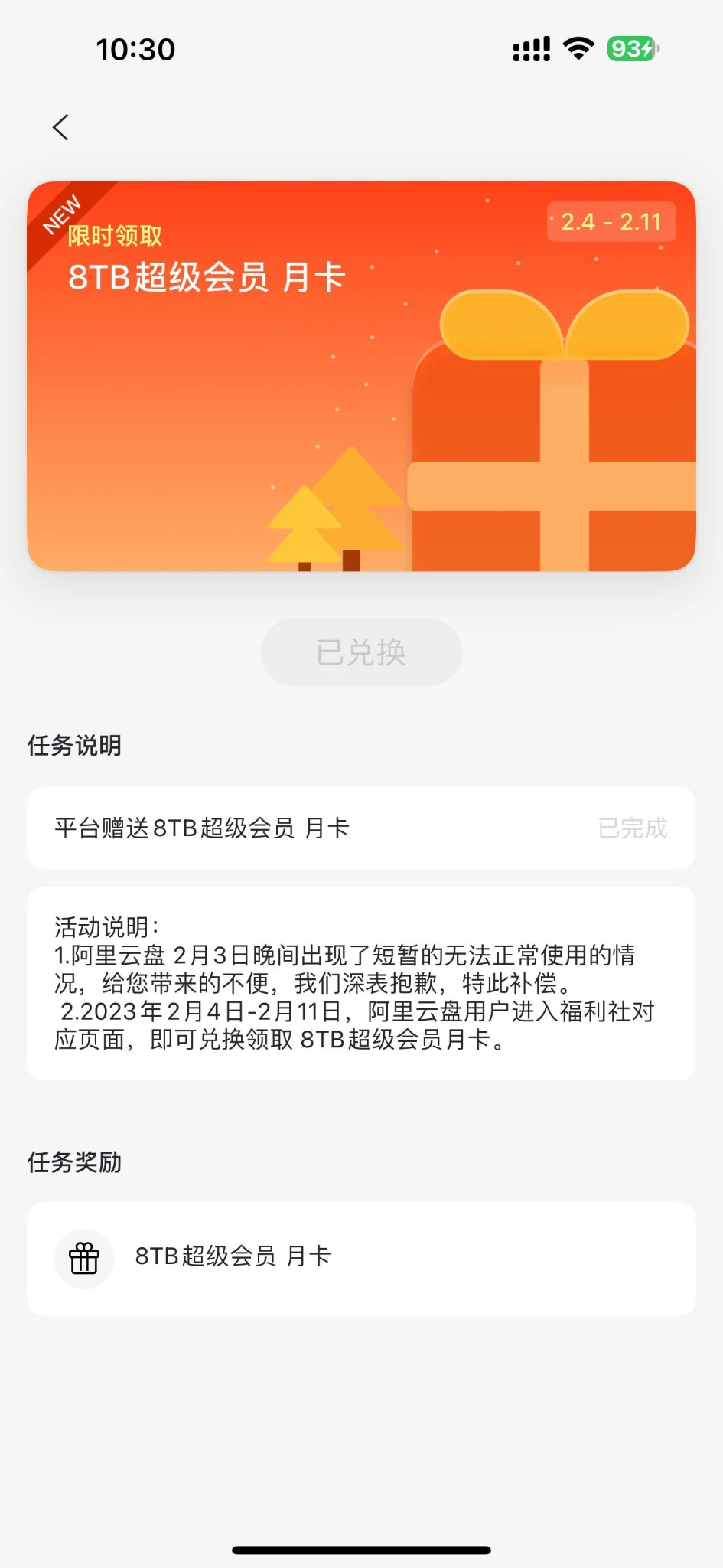阿里云盘APP 我的 福利社 8TB超级会员月卡直接领取秒到 首页每天签到可延期会员