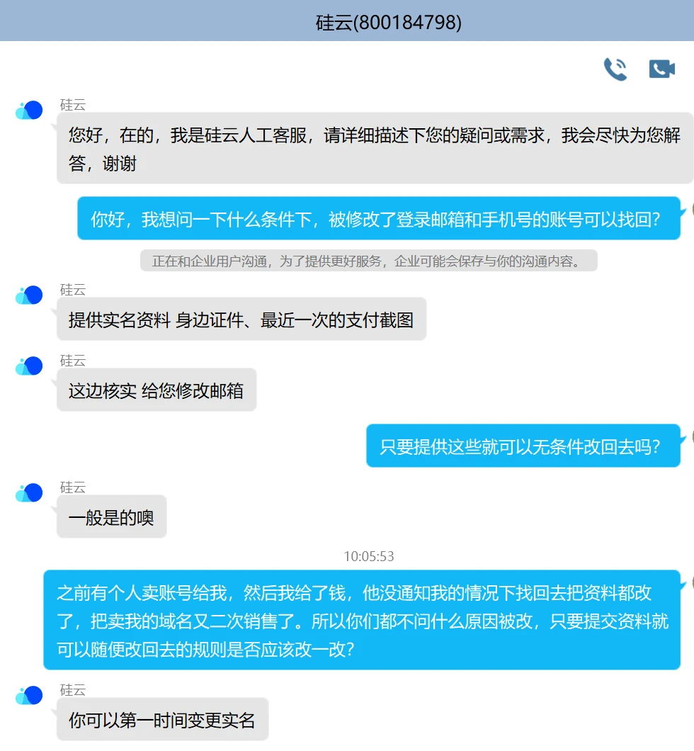 论坛里的一次域名交易,没想到硅云找回改账号和绑定手机号连个通知邮件和短信都没有,只要给资料都可以无条件找回。